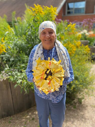 Activities led by the therapist include a sunflower rag wreath-making session. Colourful sunflowers are created from scraps of fabric, ribbons and buttons. As well as learning a new skill while socialising with others, patients get to take something lovely home with them.